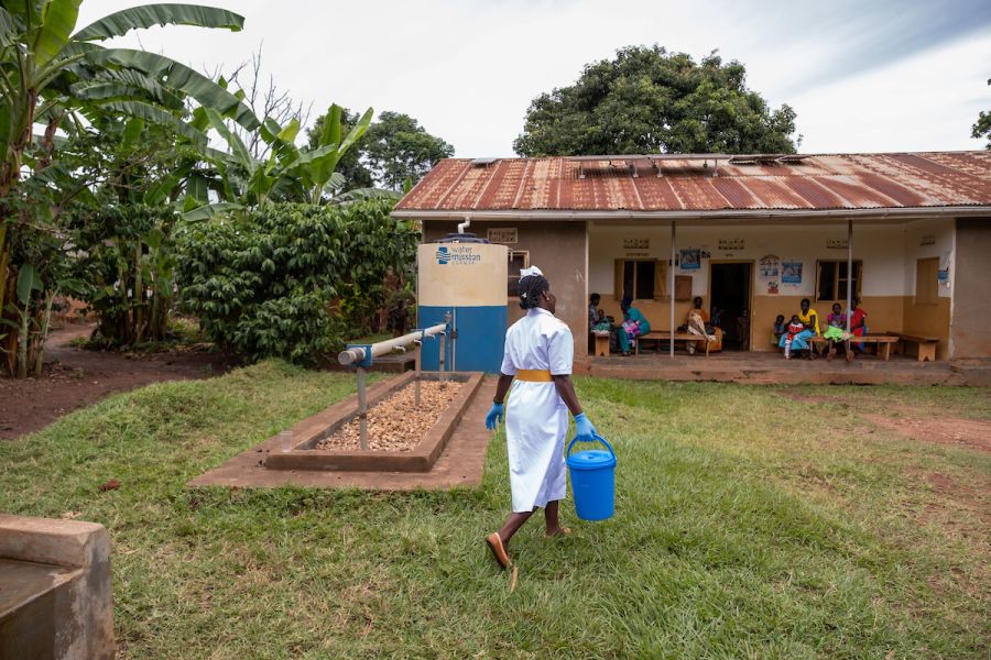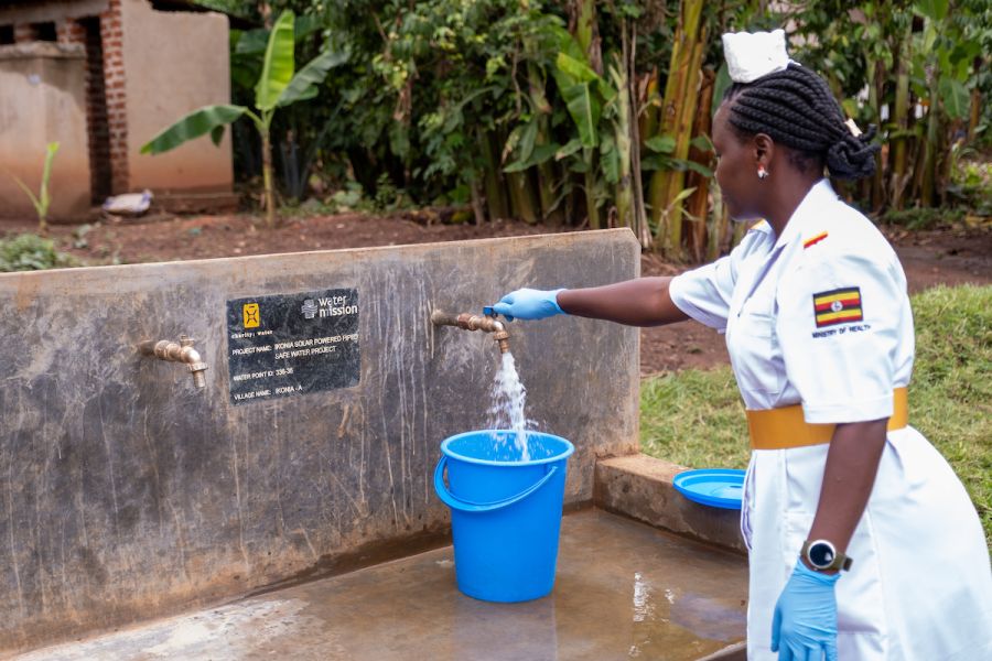 Safe water now flows directly to tap stands at the local clinic, allowing Damalie and the other nurses to effectively treat mothers and babies.