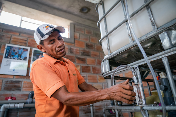 Hildebrando maintains and operates the safe water treatment system in his community.[/caption]