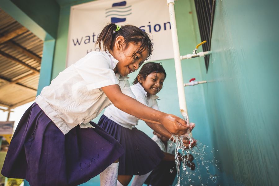 Young girls in Santa Maria del Carbon, Honduras, wash their hands in safe water.[/caption]