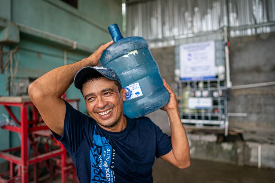 A man in Honduras receives much needed safe water after Hurricanes Eta and Iota.[/caption]