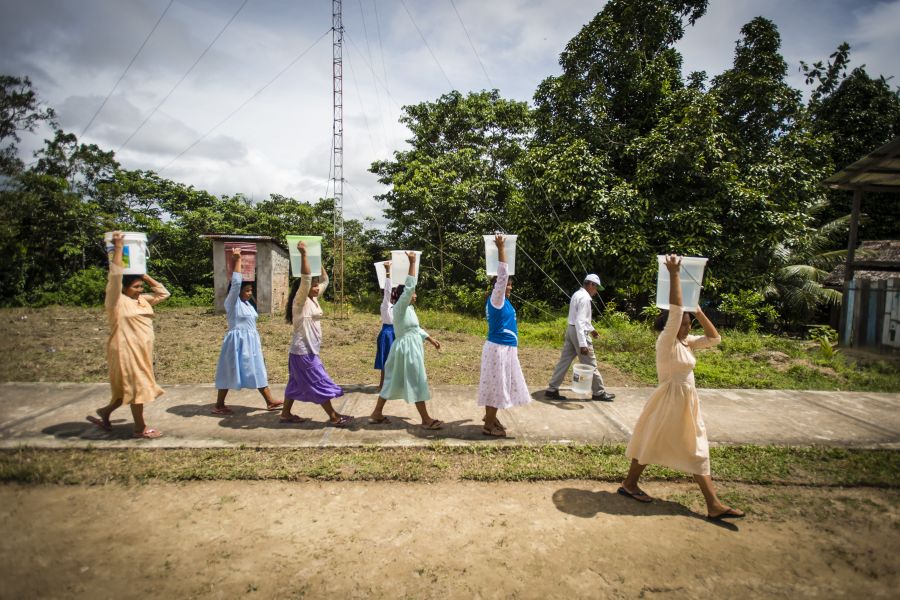 A group of women carry safe water back to their homes in Nueva Reforma, Peru[/caption]