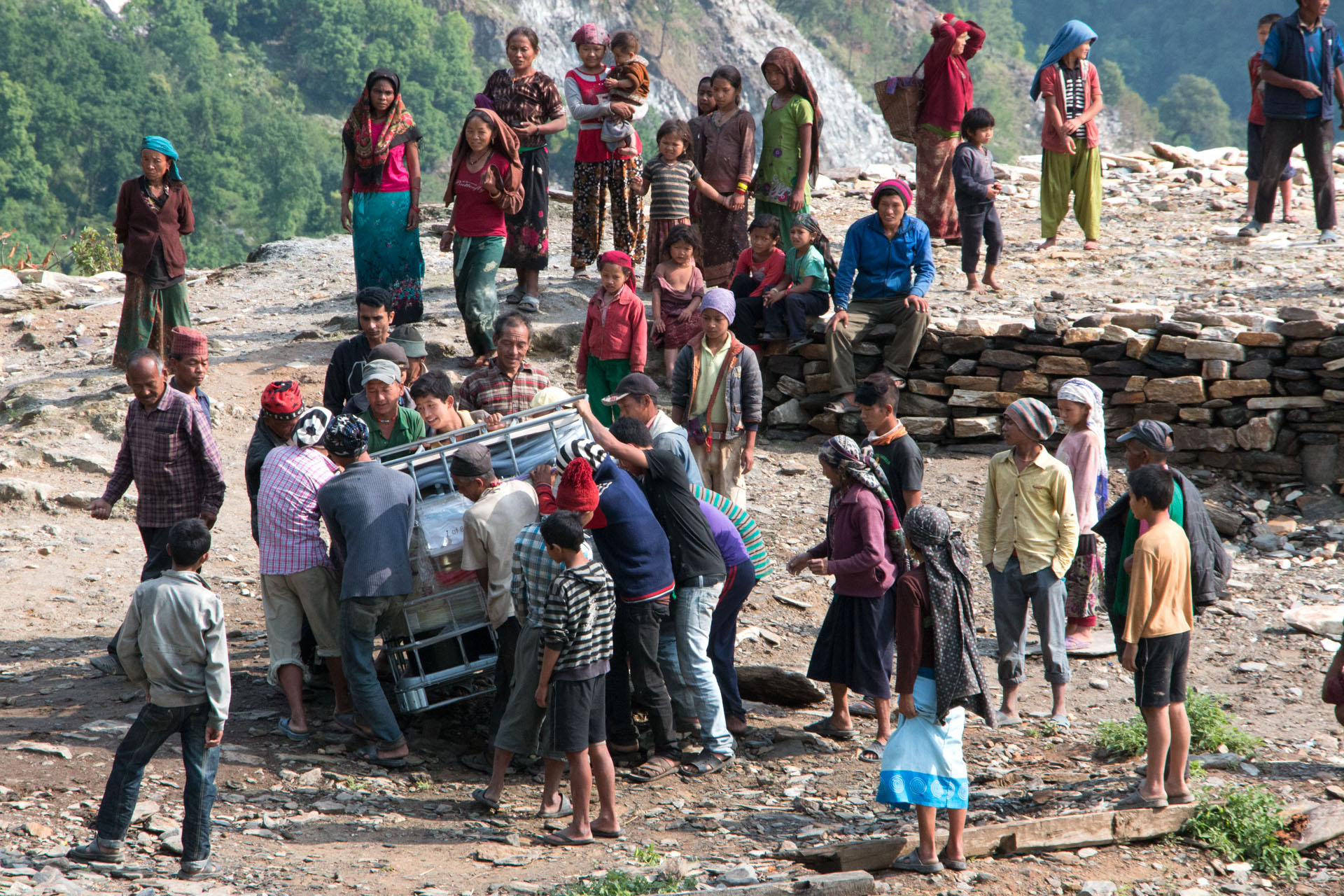 Instead of a road, what stood between Khorla and the closest accessible town was a six hour hike over the mountains and through several active landslides. Transportation by land of our 365 kg treatment system and over 1km of pipe would have been impossible, and so we teamed up with Mission Aviation Fellowship (MAF) and Fishtail Air to help us organize an airlift operation in order to give Khorla safe drinking water before the rains of the monsoon might make it impossible.