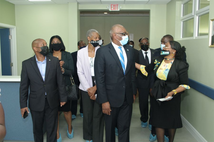Hospital Administrator Sharon Williams conducts a tour for Reward Wells (Minister of Health), Catherine Weech (Director of Public Hospitals Authority), and the Honorable Hubert Minnis (Prime Minister).[/caption]