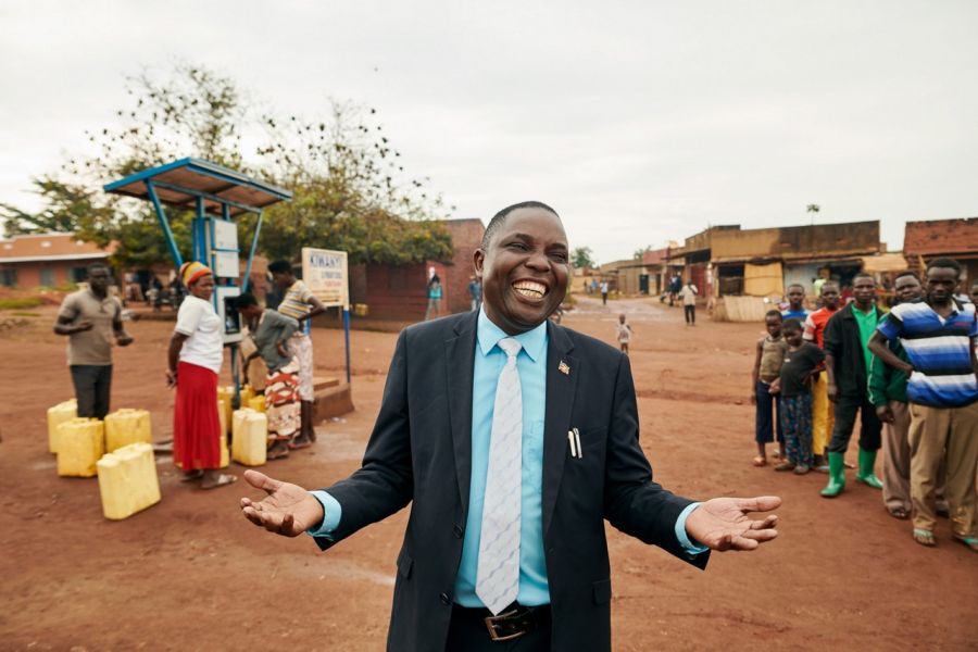 Kigongo Mathias is overjoyed that his community has reliable access to clean, safe water. (Photo credit: Grundfos)[/caption]