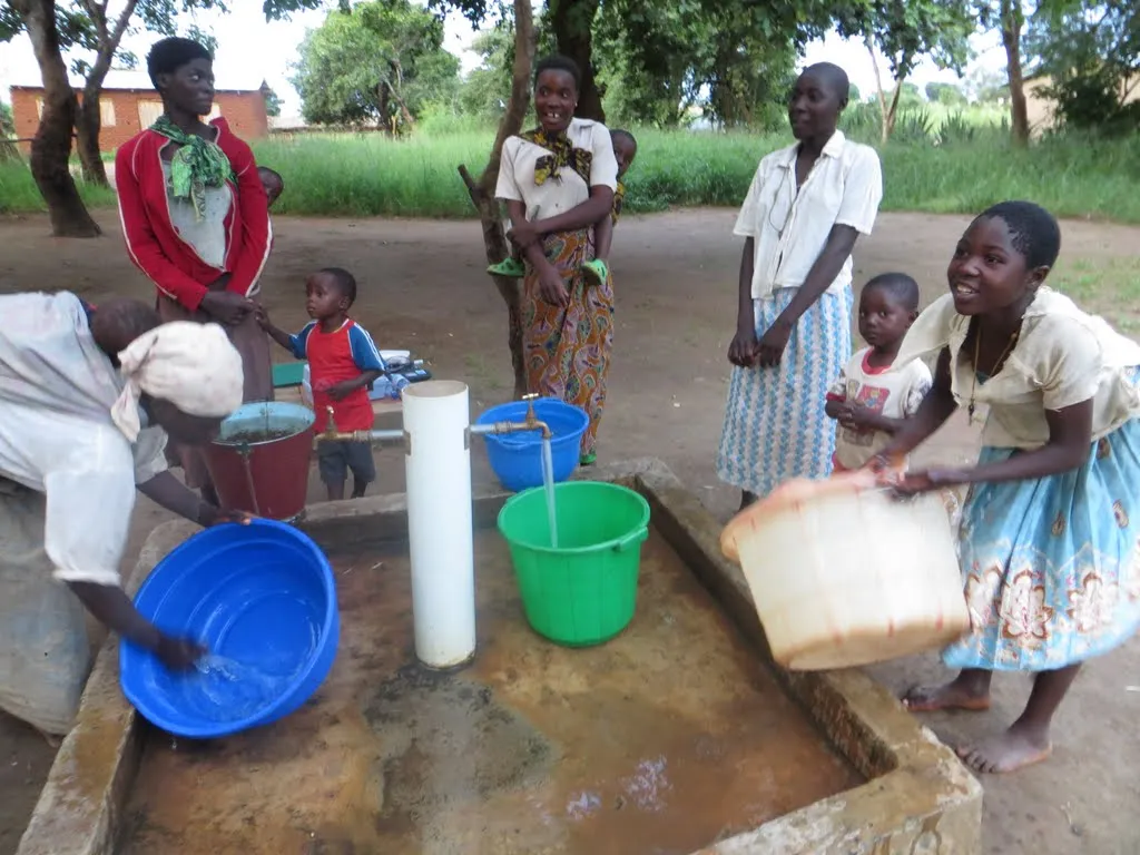 Chipolopo women and children gather at the taps to collect water. As you read above, they are now healthy and delighted to have safe water access in their own community.