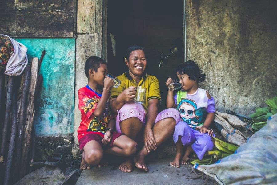 A mother and her children drink clean, safe water in Sibongkare, Indonesia[/caption]