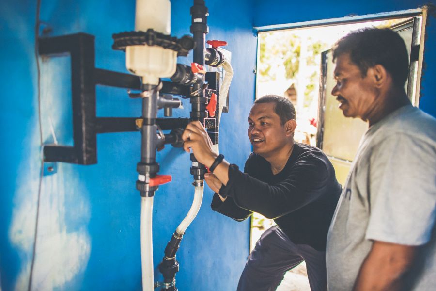 Two attendants check on a chlorinator for the Water Mission project in Sibongkare, Indonesia[/caption]